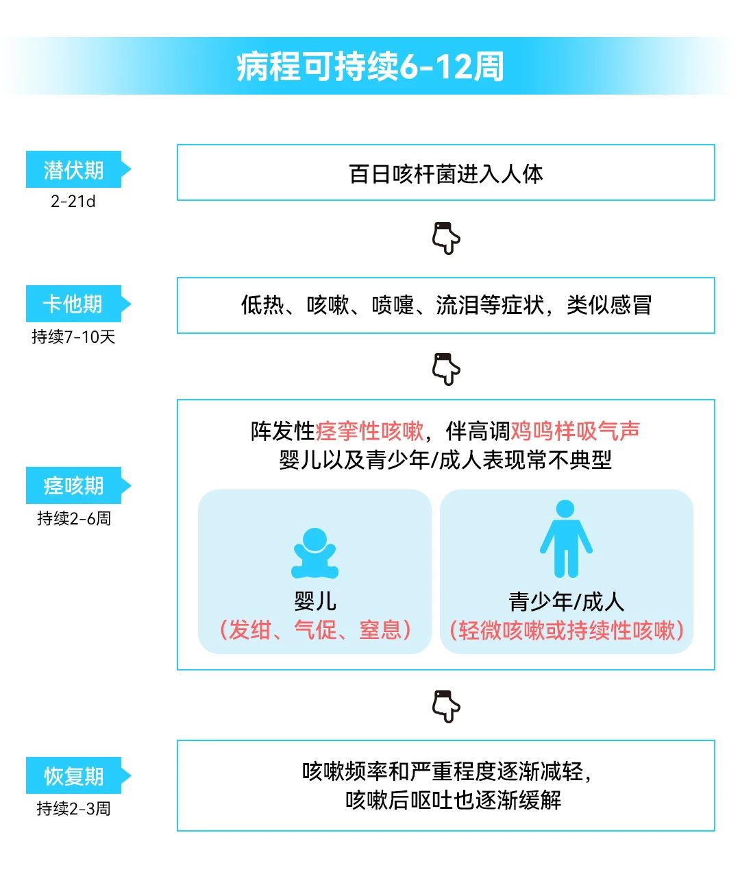 病初很像感冒,非典型病例可能無癥狀,或者僅有輕微咳嗽、有點低熱。臨床上以陣發(fā)性、痙攣性咳嗽、雞鳴樣吸氣吼聲為特征。病程可長達2~3個月,故名百日咳。