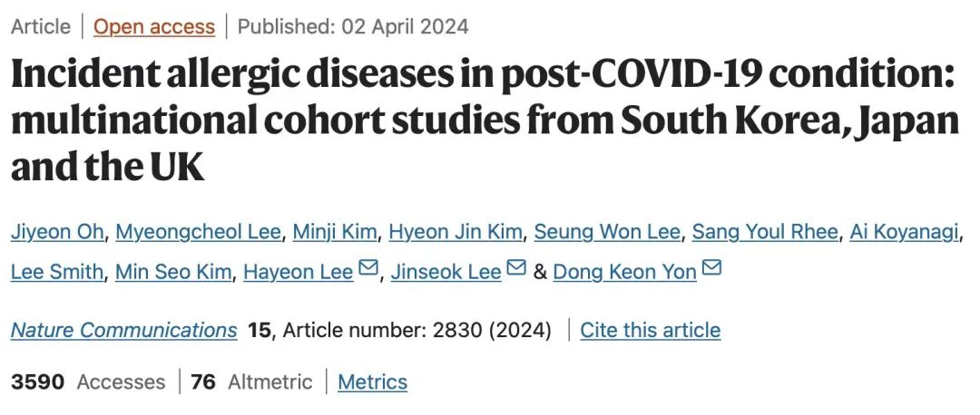 [1]Oh J, Lee M, Kim M, Kim HJ, Lee SW, Rhee SY, Koyanagi A, Smith L, Kim MS, Lee H, Lee J, Yon DK. Incident allergic diseases in post-COVID-19 condition: multinational cohort studies from South Korea, Japan and the UK. Nat Commun. 2024 Apr 2;15(1):2830. doi: 10.1038/s41467-024-47176-w. PMID: 38565542; PMCID: PMC10987608.
